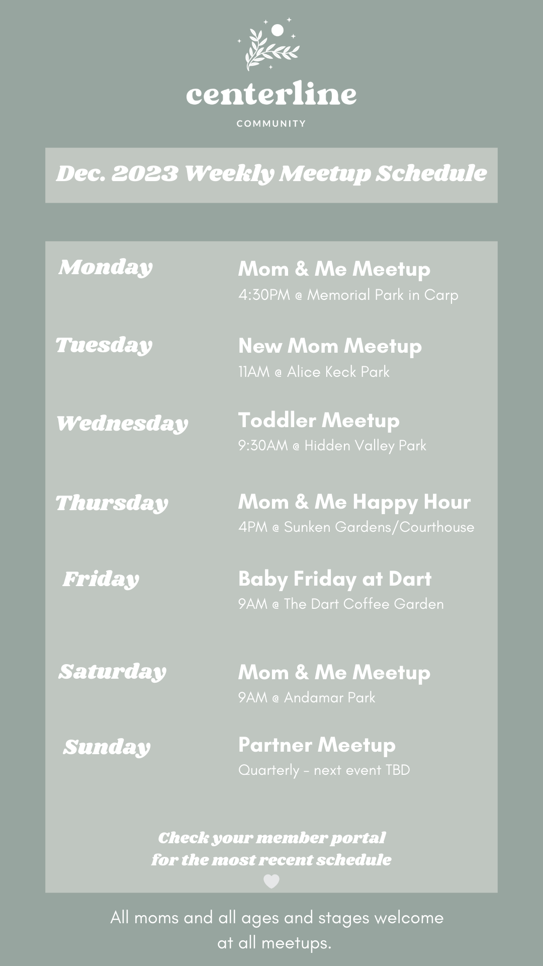 P.S. This schedule is meant to only be shared with those signed up for our Basic Community Membership, but friends and non members are totally welcome at our meetups. We just want to keep the information about our whereabouts somewhat confidential to keep everyone safe and comfortable.