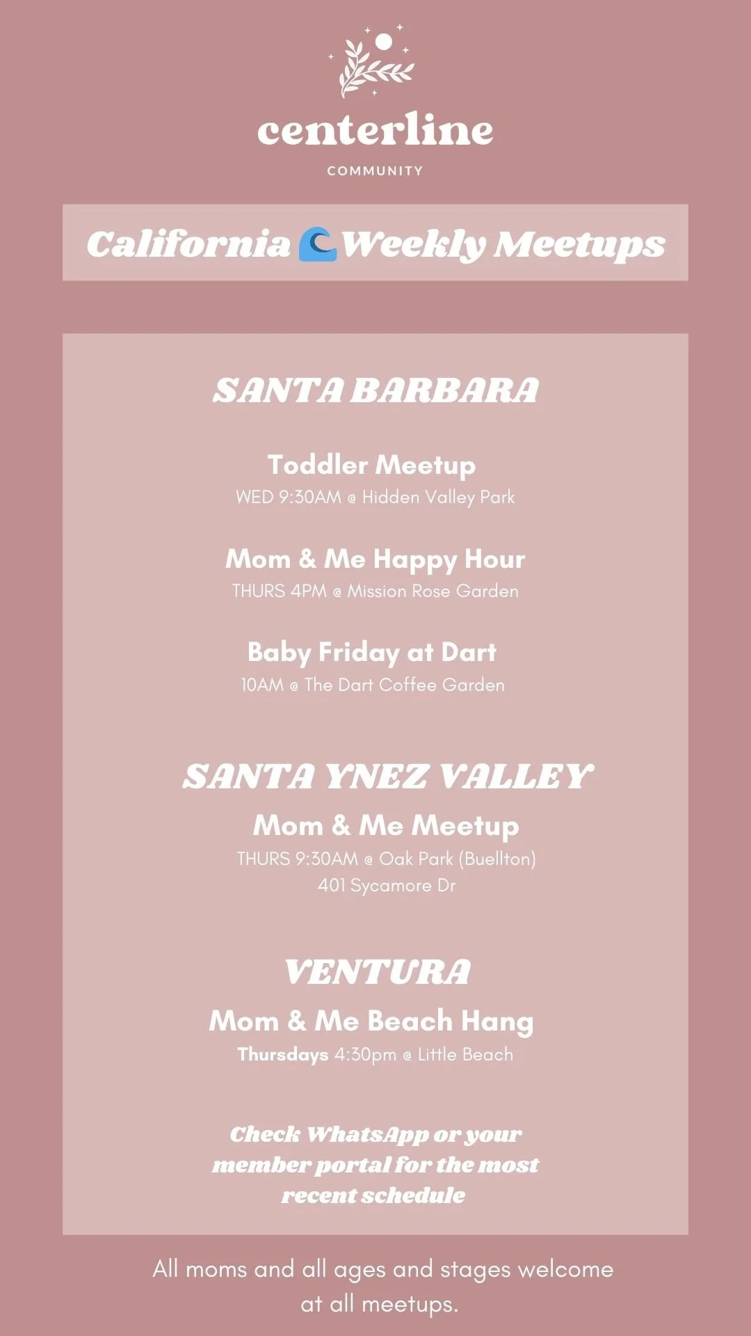 Here youβll find our weekly meetup schedule, currently available for Santa Barbara County and Ventura County moms.